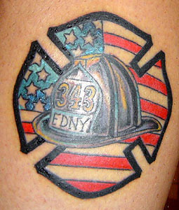 Michael Dexter Country: United States Fire Dept: Smithfield State: Rhode Island Years on job: 10 rank: Lieutenant Description: I got this as a tribute to all the brothers and sisters lost on 911. Tattoo Location: calf Studio: Anchor Steam, Newport RI |