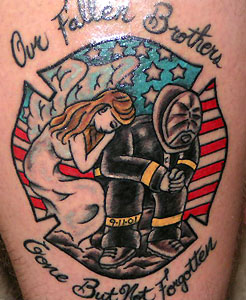 Country: United States Fire Dept: Orchard beach VFD State: Maryland Years on job: 4 Rank: Other Description: Just wanted to pay tribuite to our fallen brothers. Tattoo Location: Right Calf textfield: 2005 Studio: Mead INK |