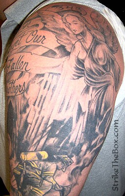Rob Hohlefelder Country: United States Fire Dept: Wake Forest Fire Dept. State: North Carolina Years on job: 5 rank: Firefighter (private) Description: After 9-11 I wanted to get another tatoo to honor the fallen heros of FDNY. This took ten hours,over four sittings, to complete. Tattoo Location: Left Arm Studio: Blue Flame, Raleigh NC Artist: Errol |