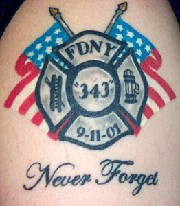 Patrick Ike Country: United States Fire Dept: Mifflin Twp. Fire Dept. State: Ohio Years on job: 12 rank: Firefighter (private) Description: I wanted something to remind me of that day in September. It took about a year to find just the right design. I took a piece of FF jewelry and a sticker I found on the net and took them Wes. He came back with a great design. The words NEVER FORGET were added just be fore he started inking me. The only thing more impressive than his design was the finished product. The tat is now two years old and looks as good as the day it was done. Tattoo Location: shoulder Studio: Body Language Whitehall, Ohio Artist: Wes |