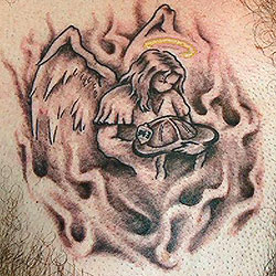 Mike Kennedy Country: United States Fire Dept: Harristown Fire Protection District State: Illinois Years on job: 14 rank: Captain Description: The faceless angel holds the helmet with the number "343" on the shield...This is just my way of proving I'll never forget. I knew in my head what I wanted, and after talking with my artist about what and why I wanted...he sketched it out as if he could see what I was thinking. Tattoo Location: Chest (right side) Studio: Twisted Images Artist: Rodney Adams |