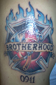 Darrin Thompson Country: United States Fire Dept: Gilman Fire Dept State: Iowa Years on job: 3 rank: Firefighter (private) Description: I wanted something to remeber my lost brothers in 9/11. Tattoo Location: upper arm Studio: Permenant Collection Artist: Joe Rosalez |