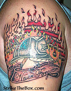 Country: United States Fire Dept: North Granville State: New York Years on job: 12 years Rank: Firefighter (private) Description: at frist i just want the old leather helmet with some flames but i want to do some more with so this is what i have come with. to the guys and girls that gave there lives at 911 this is for them may we never forget our heroes that gave there lives to save others that day. Tattoo Location: rt arm Year Inked: 2004 and 2006 Studio: extreme ink ocala fl. Artist: beth |