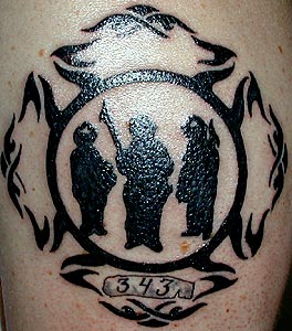 Country: United States Fire Dept: New Miami State: Ohio Years on job: 3 Rank: Firefighter (private) Description: I saw something similiar to this in a tattoo magazine, so I drew it up and took it to my brother, who is a tattoo artist. It's sad that it took 9-11 for people to truly appreciate fire fighters... but then again, the glory isn't why we do it. Anyway, I wanted to show my Tattoo Location: Shoulder Year Inked: 2006 Studio: Carter Moore Tattoo Artist: Carter Moore |