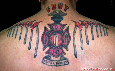 Country: United States Fire Dept: Boones Mill Fire Dept. State: Virginia Years on job: 21 Rank: Firefighter (private) Description: memorial to lost family, and 343 brothers that will 'Never Be Forgotten' Tattoo Location: back Year Inked: 2005-06 Studio: Totally Naked Tattoo's Artist: Dan |