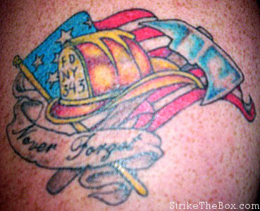 Country: United States Fire Dept: lake gaston VFD State: Virginia Years on job: 6 Rank: Lieutenant Description: 9-11 hit me really hard. this was the only way i knew to show my support to the heros who gave their life on 9-11. Tattoo Location: left arm Year Inked: 2006 Studio: rock and roll tattoos - raleigh NC Artist: chris |
