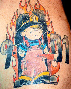 Country: United States Fire Dept: Cumberland Fire Dept. State: Maryland Years on job: 4 as career FF/Paramdic at CFD, Rank: Other Description: Tribute to the WTC. Dennis The Menace has been a nickname for me all my life and after viewing the comic strip the morning after 9-11 I knew that I had to get a tattoo of him. Dennis the menace is in bunker pants with my Cumberland Fire Helmet. 9-11-01 in the background with the twin towers also representing the number 11. tattoo on Dennis' right shoulder just like my maltese cross tattoo.Thanks to Will for the ink job and thanks to Mike for the art work. Tattoo Location: Left upper arm Year Inked: 2004 Studio: Will at Independent Ink in Frostburg,MD Artist: Art work done by Mike Furman of "St. Florians Eye", |