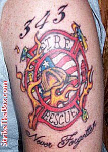 Country: United States Fire Dept: Payne Springs Fire Rescue State: Texas Years on job: 5 Rank: Lieutenant Description: I took different designs from other tattoo's to design my personal one. This is a tribute to all of the fallen brothers at the World Trade Center. This is a very special tattoo to me. Hope you will see the meaning behind it. Always Remember are fellow fallen Brother's from 9-11-01. Tattoo Location: Left Arm Year Inked: 2006 Studio: Joker's Tattoo Studio Artist: John McManus |