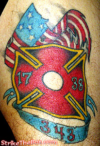 Joe "BigShow" De Piano Country: United States State: New Jersey Fire Dept: Toms River Co. 1 Sta. 25 Year Started in Fire Service: 1991 Rank: Lieutenant Description: I have a Maltese cross that has the station numbers of each dept. I have served thus far, in the center is a blank for the towers and banner dedicated to the 343 brothers lost in 911 the American flag in back is representive of the the flag from the towers. Tattoo Location: left bicep Year Inked: 2005 Studio: Bayside Tattoo Artist: Sean |