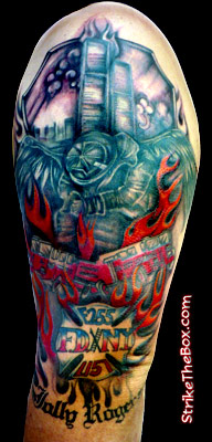 Country: United States State: New Jersey Fire Dept: East Franklin Year Started in Fire Service: 2001 Rank: Lieutenant Description: This tattoo is all 9-11 the bottom of the tattoo is where I stayed in ny on 9-11 with my old dept. you really have to take a good look at it there is alot of detail. Tattoo Location: left upper arm Year Inked: 2007 Studio: Inksanity Artist: Sue (the owner) |
