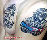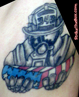 Country: United States State: Vermont Fire Dept: Saint Michael's Fire and Rescue Year Started in Fire Service: 2001 Rank: Lieutenant Description: This is one of my two 9/11 memorial tattoos. I found this design on a website. The image in the mask in combination with the flag are what drew me in to this design. Tattoo Location: Left Shoulder Year Inked: 2004 Studio: Body Art Tattoo |
