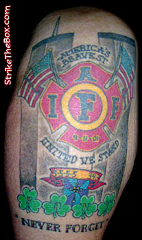 Norm Glover Country: United States State: Missouri Fire Dept: St.Louis County (Lemay) Years on job: 26 Rank: Lieutenant Description: "Never Forget" says it all I worked at ground zero with my friend,he works for the FDNY. Tattoo Location: Right upper arm Year Inked: 2001 Studio: Craig's Artist: Craig |