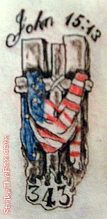 Country: United States State: Virginia Fire Dept: Roanoke Fire-EMS Year Started in Fire Service: 2000 Rank: Firefighter (private) Description: I wanted to honor those fallen in 9/11, hence the towers and "343". I also wanted honor those fallen throughout firefighting history, hence the passage. I feel that the artist did a great job of bringing that all together. Tattoo Location: Lower back Year Inked: 2008 Studio: Tattoos by Gypsy Artist: Brice |