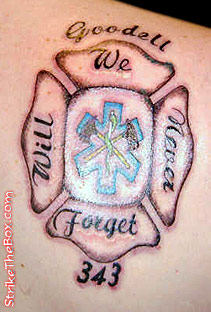 Joshua Baldwin Country: United States State: Iowa Fire Dept: Goodell fire rescue and ems Year Started in Fire Service: 2003 Rank: Other Description: I wanted to get our crest as a tattoo. I had taken my first responder test the day before I got it so I decided to get the ems star of life in it as well. I also wanted to remember the fallen brothers of the fire service for their heroic acts on September 11. Tattoo Location: right shoulder blade Year Inked: 2007 Studio: Rainbow Ink Artist: Sue |