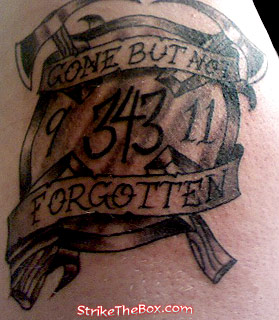Country: United States State: Texas Fire Dept: Quinlan Vol. Fire Dept. Year Started in Fire Service: 2002 Rank: Firefighter (private) Description: I want something that would remember the firefighter's that gave it all on 9-11. Tattoo Location: Left arm Year Inked: 2008 Studio: Fine Line Artist: Jon |