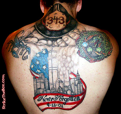 Tom Whitman Country: Canada State: Nova Scotia Fire Dept: Waterville and District Volunteer Fire Year Started in Fire Service: 1999 Rank: Lieutenant Description: A Memorial to Our Fallen Brothers of 9/11. Tattoo Location: Back Year Inked: 2008 Artist: Chris Weagle