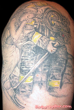 Country: Canada State: Ontario Fire Dept: AECL Fire Department Year Started in Fire Service: 2005 Rank: Firefighter (private) Description: The meaning behind me getting this tattoo is. This picture is known to many as a tribute / memorial for the firefighter that made the ultimate sacrifice during 9/11. Also for me it symbolizes that regardless what situation you might get myself into in life or on the job there is always someone looking out for me. I decided to add the fire axe not only its one of our most known tools but it symbolizes there is always a way out of any situation good or bad. And to add as the guys at work would tell you. You need in or need something broken just ask me. Tattoo Location: upper left arm Year Inked: 2008 Studio: Wizards Den Artist: Yvan |