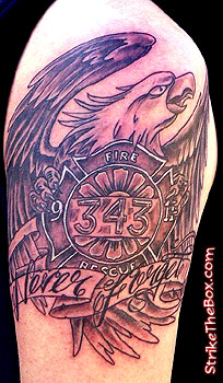 Jerod Country: United States State: Illinois Fire Dept: Akron/Princeville Fire-Rescue Year Started in Fire Service: 2005 Rank: Firefighter (private) Description: 9/11 Memorial for the fallen firefighters. Tattoo Location: Right upper arm Year Inked: 2008 Studio: Mojo Studios Artist: Dan |