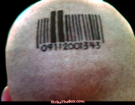 Description: A self designed tattoo: The bar code represents my views on how human life has become nothing more then a commodity(blood for oil) the numbers represent the wtc date and 343 number of ff died in the WTC and the two thick Bar codes represent the twin towers. on back of my skull so it will always be on the back of my mind (never forget)