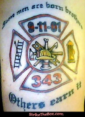 Rob Simonds Country: United States State: Maryland Fire Dept: Baltimore City Fire Department Year Started in Fire Service: 2009 Rank: Firefighter (private) Description: Friends and I put this ink together when I vollied to remember the fallen brothers on 9-11. It says "Some men out born brothers, Others earn it". Tattoo Location: Right upper arm Year Inked: 2007 Studio: Meade Tattoo Artist: Rick |