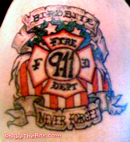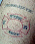 Description: I had a maltese cross and my nickname first tattooed in 1996. I just recently had it covered up with an improved maltese cross, banners, and the Amercian Flag.