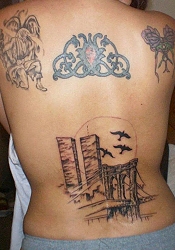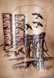 "The three birds are symbold of my friends, the towers are symbols of all the lives lost that day and the brooklyn bridge is a symbol of where I am from. The work was done by Mel she works out of Clan Tatu in Tempe Arizona. I still have some work to be done on this piece the sunset has to be colored and the date is going to be placed in the base of the bridge. May My Friends Rest In Peace" |