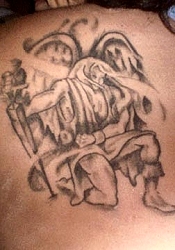 "Below is Michael the angel of firefighters he is on the back of my left shoulder for a friend i lost joey agnello from ladder 118 in the ribbon that goes through the picture it will say R.I.P Nello ." |