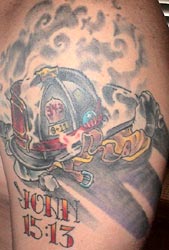 Steve Headley Omaha Fire Dept Local 385 The tatt is a smoldering helmet and debris which is casting a shadow of the trade towers. The artist is Devon Ferguson Co-Owner of Liquid Courage Tattoo in Omaha NE.