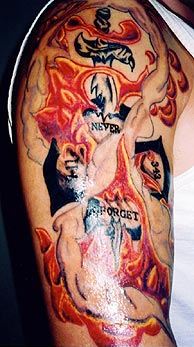 country: United States Fire Dept: Parma Hts State: Ohio Years on job: 12 rank: Firefighter (private) description: This is my first tattoo. It has Excaliber (for Honor) going through the Maltese Cross. Never Forget and 911 within the cross. artist: Aaron |
