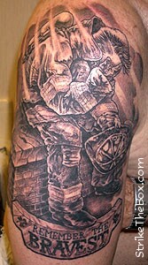 This detailed tattoo belongs to Bill Monahan with the Los Angeles County Fire Department. "My tattoo was done by Chris Dingwell from Sanctuary tattoo. Chris as you can see from this tattoo and others he has done on your site is a very gifted artist. He came to the tattoo show in Oakland in August and completed it in seven hours..I work on our Search and Rescue Task force 134....this tattoo was meant as a memorial for the brothers lost in New York as well as my partner and fellow La County Firefighters that have made the ultimate sacrifice and all others throughout my career." |