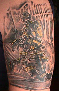 This detailed tat was sent into us by it's collector, Joe Leonetti. Joe is a FF from the Wilmington Fire Dept. in Delaware. "This upper arm piece was inked by George from August Moon Tattoo shop in Bear Delaware. If you look in the background you can see some of the towers through the smoke." |