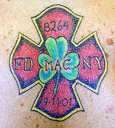 This Tribute tattoo belongs to Greg fix of the Wilmington fire dept. Squad 1 Wilmington, nc "The tattoo is in Memory of My best friend Brian Mcaleese from FDNY Engine 226 on State St in Brooklyn." the ink was done by matt becker of port city tattoo in wilmington, Nc. Brian worked with Dave DeRubbio on Engine 226. Dave's Brother also has a tribute tattoo tatt on STB, click here. |