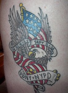 This World Trade Center tribute tattoo was sent to us by Peter Grivins Eaton Rapids, MI. "I got it for my birthday in October of last year. At the time I was doing police work too, so the banner has FDNY and NYPD." |