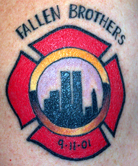 My name is Dennis Haas, I am a retired firefighter from Abilene, TX. I designed the artwork and took it to Orlando Romo at Atomic Tattoos in Austin, TX. who did the work. The tattoo was done in mid-March 2002. I had the tattoo done so that it could be seen every day, reminding all who see it that we can never forget the sacrifice of our brothers on that day. |