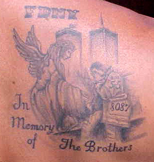 This beautiful tribute tattoo was sent into us by the collector, Mike Clarke. "This tattoo was designed by myself and Bonnie Doak of Tattoos By Bonnie, in Brunswick, Maine. I am with the Massachusetts FEMA Urban Search and Rescue Task Force and operated at the WTC for the week following the attacks. I lost 22 friends from the FDNY and my high school on Long Island. The Tat means more than my writing capabilities can describe. My Father, a retired Lieutenant from FDNY saw the work for the first time 4th of July week. His reaction was one of Compassion. It was an Honor to be deployed to the WTC and to work with the FDNY. May God Bless them all. " |