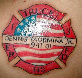 This tribute tatt belongs to Jeff Taormina, who lost his older brother Dennis in the WTC on 9/11. " I then joined the East Rutherford Fire Dept. on Truck one my line number is 143, this is all on the Tat. I am also on in Nutley NJ." Tattoo was done at Starlight Tattoo in Bellville NJ by Max. |