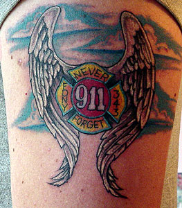 This unique design belongs to Jeff Dedrick, a firefighter for Brooklyn Park MN. The tattoo artist is Brian Qualley of Happily ever after tattoos. Brian is the most award winning tattoo artist in Minnesota. |