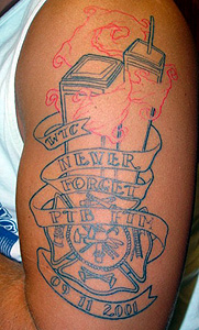 This work in progress was sent to us by Jerry Harder from Brownsburg Fire; Brownsburg Indiana. "Here is my memorial tattoo of the WTC. It is unfinished at this time. This setting took 3 hours. " |