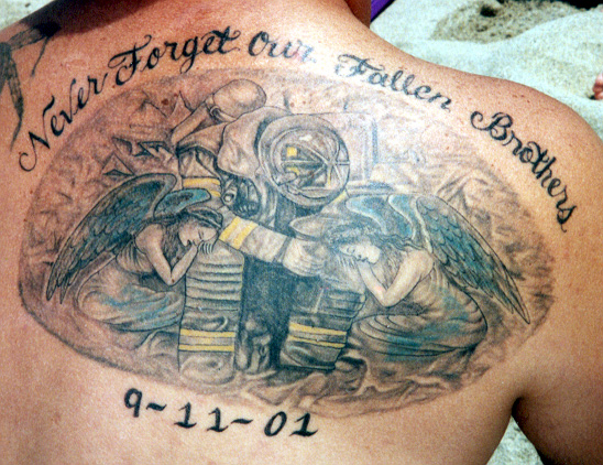 This engaging tattoo was sent to us by J. Fernandez from LA County Fire. "In Tribute to our Fallen Brothers" Artwork done at Unlimited Tattoo in the city of Arcadia CA. Artist: Raul, aka: Lonely Boy. Artwork took approximately 6 hours. |
