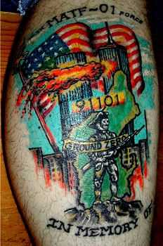 This tat was sent into us by a firefighter who worked at ground zero. " My name is john. I am a member MATF-01 (MA. USAR team ). We worked at ground zero in New York for one week. My tattoo was done by Josh at ART CITY TATTOO STUDIO in Johnston, Rhode Island " |