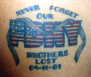 This original design was sent to us by Shane Ohrvall. Shane is a career firefighter with Anne Arundel County MD IAFF Local 1563 assigned to truck 33 "I designed this tattoo approx. One week after the attack. It was done by Chris at tattoo gardens in edgewater,Md.. My name is Shane ohrvall I am assigned to truck 33.the flag portion of the tattoo was taken from a helmet sticker from Howard County,Md." |