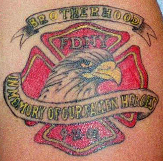 The collector of this tat is Terry Reeverts; a paramedic for the Byron Illinois Fire Department. "This tattoo is a tribute for all those that lost their lives on September 11th. Mark Meyer, who works at the Millennium in Rockford, Illinois, inked this great tattoo." |