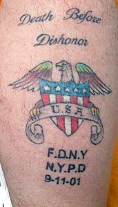 country: United States Fire Dept: Atlantic Beach Fire/Rescue (retired) State: North Carolina Years on job: 25+ years rank: Other description: I got this tattoon 9/22/01, after learning how many of our Brothers were lost that day. I feel that they "chose" Death before Dishonor". They would not leave the Towers until they knew everyone had gotten out. "Rest will, my Brothers, we will carry you ALWAYS with us". studio: SkinArts in Jacksonville,N.C. artist: Michael |