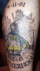 This very original tattoo was sent to us by Mike Haskins. "I had this tattoo done by rich kocis from prairie tattoo of chicago heights IL. I am a firefighter for the south chicago heights fire dept.the bottom of that tatto says brotherhood." |