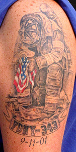 This beautiful tribute piece the blends two styles of tattooing, black & gray & color work, belongs to Jeff Wright, a 24 year veteran of the District of Columbia Fire Dept. serving as a Lieutenant assigned to Truck Co. 3. "As were many, I was working that fateful day of 9/11 and decided then, as have others, to never to forget what terrible price was paid by our brothers in New York City. In looking for the right tribute, I turned to the now famous photo fittingly used by so many with one minor change, the addition of the Stars & Stripes. It was inked with great care by Alfie of "Marks of the Spark Tattoos" in Frederick, Maryland during two three hour sessions. " |